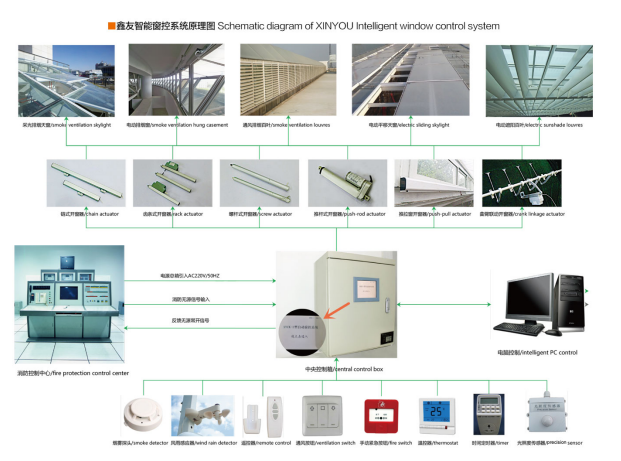 智能通風控制系統由智能控制箱、墻裝開關、遙控器、風雨感應器、開窗器等組成,用戶可根據日常室內環境的變化,通過遙控器或者開關來對窗戶進行開啟和關閉的控制。