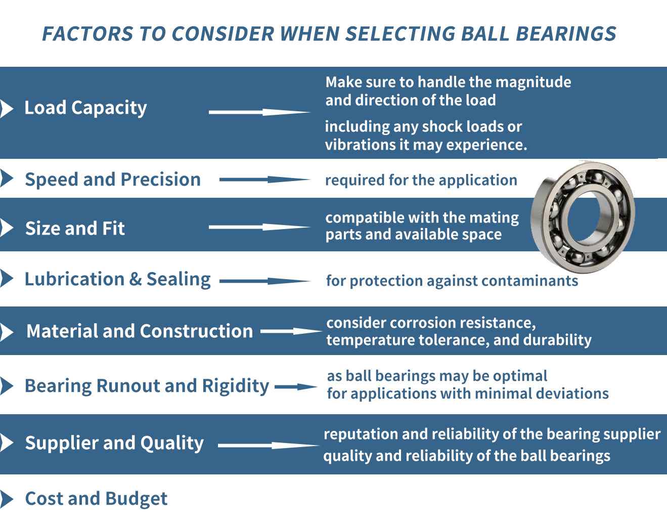 在選擇滾珠軸承時,必須考慮負載能力、速度和精度要求、尺寸和配合兼容性、潤滑和密封需求、跳動和剛度公差、材料和結(jié)構(gòu)對環(huán)境的適用性等因素(見下圖)。有關更多詳細信息,請參閱下圖。