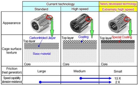 在軸承保持架上涂上特殊涂層可以減少保持架和小齒輪滑動(dòng)區(qū)域之間摩擦產(chǎn)生的熱量,還可以提高保持架的耐磨性。因此,新開發(fā)的產(chǎn)品可以處理大約是標(biāo)準(zhǔn)保持架設(shè)計(jì)兩倍的小齒輪速度,大約是當(dāng)前高速保持架設(shè)計(jì)的1.5倍。