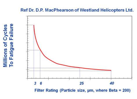 顆粒污染對軸承壽命的影響得到了MacPhearson博士開展的一項研究項目的支持,該項目研究了過濾器額定值與數(shù)百萬次軸承循環(huán)疲勞失效之間的關系,如上圖所示,污染水平越低,軸承壽命越長。