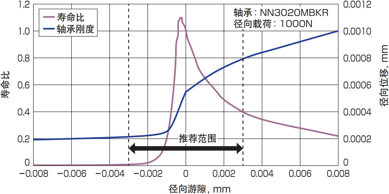 安裝時的徑向游隙,對發(fā)揮圓柱滾子軸承的最佳性能非常重要。如右圖可知,從0 μm到稍許負游隙的一側(cè)是兼顧剛度、壽命的最佳游隙。