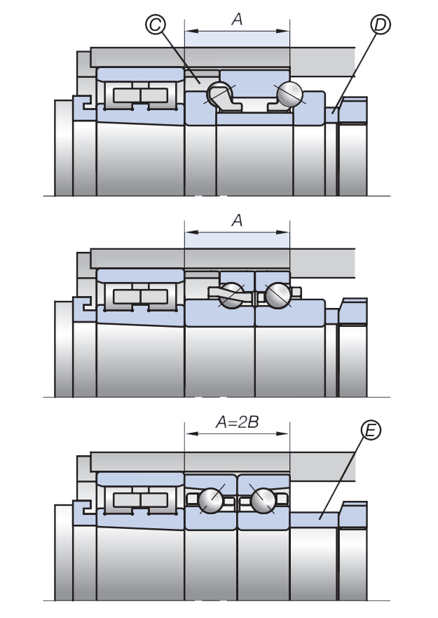 為方便替換主軸用20系列推力角接觸球軸承,BAR、BTR系列采用特殊寬度尺寸。無需變更軸與軸承座,僅去掉左圖中的 C 隔圈,并將 D 隔圈替換為 E 隔圈,即可完成軸承替換。