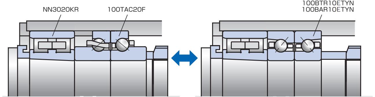 為方便替換主軸用20系列推力角接觸球軸承,BAR、BTR系列采用特殊寬度尺寸。無需變更軸與軸承座,僅去掉左圖中的 C 隔圈,并將 D 隔圈替換為 E 隔圈,即可完成軸承替換。